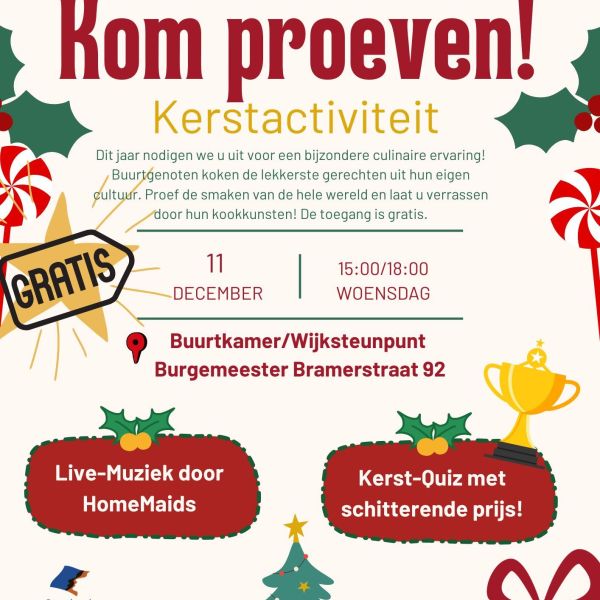 Op woensdag 11 december bent u van harte welkom om te genieten van een bijzondere culinaire ervaring bij Buurtkamer / Wijksteunpunt (Burgermeester Bramerstraat 92, Hardenberg)! Tijdens deze kerstactiviteit koken buurtgenoten heerlijke gerechten uit hun eigen cultuur. Proef smaken van over de hele wereld en laat u verassen door hun kookkunsten.