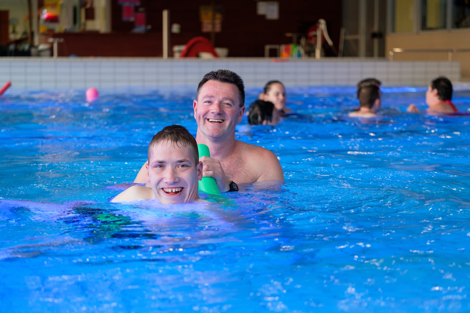 ‘Ik ben de enige man hier in het bad. Voor de jongens is het fijn dat ik er ben. De klik is er, ze durven ballen tegen mij aan te gooien. Een lolletje hoort erbij, praatjes maken, een beetje uitdagen. Ik maak mensen met een beperking graag aan het lachen. Dan vragen ze me of ik nog een mop wil vertellen. Vervolgens gaat er een schaterlach door het zwembad. Je moet je wel een beetje kunnen aanpassen en inspelen op wat een ander nodig heeft. Het is ook verantwoordelijk werk, je moet alert zijn dat het goed gaat met iedereen in het zwembad. Daarom is er altijd een vrijwilliger op de kant die het overzicht bewaart en twee of drie zwemmen mee. We hebben ruimte voor meer vrijwilligers.’